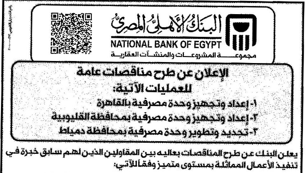 | الوصف | اعداد و تجهيز وحدة مصرفية جديدة بمحافظة القاهرة |